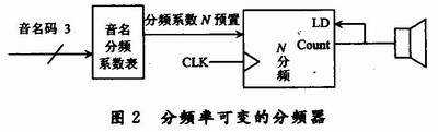 因此若采用模值和輸入脈沖頻率都可控的計(jì)數(shù)器實(shí)現(xiàn)信號(hào)分頻,可根據(jù)音程碼選擇分頻計(jì)數(shù)器的輸入脈沖頻率fs、根據(jù)音名碼控制分頻計(jì)數(shù)器的模值N,如圖2所示。