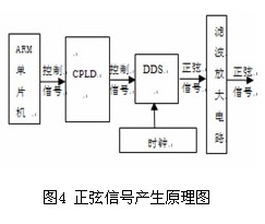 采用DDS技術(shù)在當(dāng)前的測(cè)試測(cè)量行業(yè)已是一種主流的做法,其頻率精度可隨相位累加器的位數(shù)而定。本系統(tǒng)采用單片機(jī)+專用DDS芯片的方式產(chǎn)生正弦信號(hào),其原理如圖4所示,ARM單片機(jī)向CPLD 發(fā)出控制命令,CPLD 在時(shí)鐘下譯碼后產(chǎn)生DDS的控制信號(hào),產(chǎn)生出相應(yīng)頻率的正弦波信號(hào),該正弦信號(hào)經(jīng)過(guò)濾波放大后,輸出相應(yīng)幅值的正弦信號(hào)。