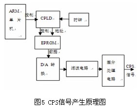 曲軸位置信號(hào)(CPS)是PCM控制點(diǎn)火系統(tǒng)中最主要的傳感器信號(hào),為適應(yīng)多種PCM的需求,設(shè)計(jì)采用CPLD和DA的方式產(chǎn)生。CPS信號(hào)產(chǎn)生原理如圖5所示,在EPROM中存有一個(gè)周期的正弦表數(shù)據(jù),當(dāng)需要產(chǎn)生 CPS信號(hào)時(shí),ARM單片機(jī)對(duì)CPLD進(jìn)行設(shè)置,CPLD根據(jù)接收的控制命令,通過(guò)時(shí)鐘計(jì)數(shù),產(chǎn)生讀存儲(chǔ)器的信號(hào),并向EPROM提供合適的地址信號(hào)和控制信號(hào),EPROM輸出相應(yīng)地址的數(shù)據(jù),經(jīng)D/A轉(zhuǎn)換,變成單端CPS模擬信號(hào),然后經(jīng)濾波電路和單端轉(zhuǎn)差分處理電路,輸出CPS差分信號(hào)。在實(shí)際的電路實(shí)現(xiàn)中,對(duì)CPS信號(hào)的控制可由計(jì)算機(jī)通過(guò)CAN總線向ARM發(fā)出控制命令進(jìn)行設(shè)置,因此,即使ARM芯片在運(yùn)行過(guò)程中復(fù)位,電路仍能輸出正確的CPS信號(hào),以確保測(cè)試周期的正常進(jìn)行。