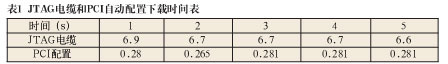 為了對比基于PCI總線的FPGA高速配置方案與基于ByteBlasterIIJTAG下載電纜的速度性能,首先使用QuartusII7.1軟件采用JTAG方式對FPGA2配置5次,計(jì)算每次下載所示時(shí)間,得到如表1中所示的數(shù)據(jù);再使用本系統(tǒng)中基于PCI總線的配置功能對FPGA2配置5次,軟件會(huì)自行計(jì)算總的下載時(shí)間,得到如表1中所示的數(shù)據(jù):