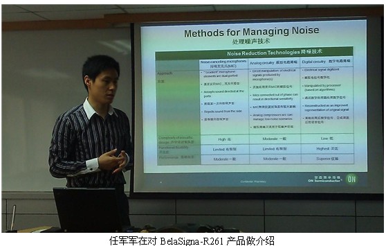 生活在都市的人們通常會在嘈雜的環(huán)境中撥打或接聽電話,人們總是希望能夠像在田野中一般獲得清晰并且沒有失真的聲音。對于手機(jī)廠商來講,采用能夠清晰拾取 語音并抑制噪聲的解決方案是關(guān)鍵。為了應(yīng)對上述挑戰(zhàn),安森美半導(dǎo)體推出了高性能語音捕獲SoC方案BelaSigna-R261。安森美半導(dǎo)體音頻與助聽 器中國市場開發(fā)經(jīng)理任軍軍在日前的產(chǎn)品發(fā)布會上對BelaSigna-R261的特性做了介紹,并現(xiàn)場對產(chǎn)品進(jìn)行了演示。
