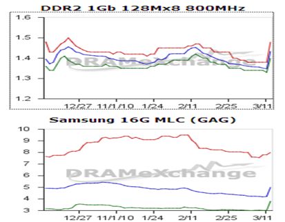 從DDR3來看,市場已經(jīng)聞風(fēng)而動,顆粒價格有明顯上升的勢頭,尤其是金士頓內(nèi)存(見下表),未來一段時間內(nèi)價格有可能繼續(xù)上揚。一些經(jīng)銷商預(yù)計閃存價格地震后將出現(xiàn)15%以上的漲幅,已經(jīng)開始小幅提價,并出現(xiàn)了惜售的心態(tài)。目前甚至不排除部分經(jīng)銷商囤貨了。