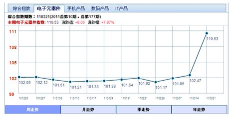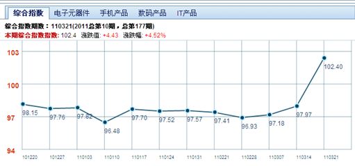 需要特別指出的是,四大成分指數(shù)之一的電子元器件指數(shù)的漲幅最為明顯,本期指數(shù)從3月14日的102.47點,漲到了110.53點,漲幅為7.87%,也是3年來之最??磥?,日本地震對華強北指數(shù)的影響也是達到了峰值,也充分說明,華強北電子元器件市場已經(jīng)受到了日本地震的強烈沖擊。