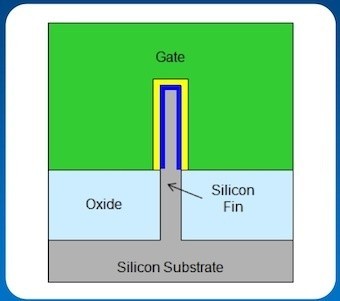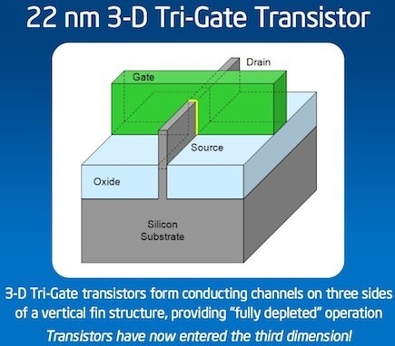 英特爾稱(chēng)之為3D晶體管,但從技術(shù)上講,這是三門(mén)晶體管。傳統(tǒng)的二維門(mén)由較薄的三維硅鰭所取代,硅鰭由硅基垂直伸出。