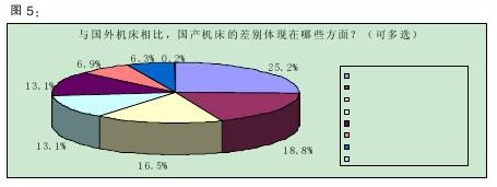 據(jù)中國機(jī)床工具工業(yè)協(xié)會(huì)統(tǒng)計(jì),2010年我國機(jī)床工具產(chǎn)品進(jìn)口總額為157.2億美元,同比增長62.0%,國內(nèi)機(jī)床進(jìn)口額與歷史最高的2008年同期相比還增長了27.8%,創(chuàng)歷史新高。進(jìn)口的增長迅猛表明國內(nèi)機(jī)床與國外機(jī)床的差距依然很大。本次調(diào)查報(bào)告顯示,中外機(jī)床的差距主要體現(xiàn)在三個(gè)方面:加工精度(25.2%)、可靠性(18.8%)、機(jī)床內(nèi)部電、氣、控等配置(16.5%)。緊跟其后的是加工速度和外形方面的色彩、精美程度等,均占13.1%(詳見圖5)。由此可見,技術(shù)尤其是對精準(zhǔn)度和可靠度是國外機(jī)床領(lǐng)先國內(nèi)機(jī)床的優(yōu)勢來源。另外,對外形的關(guān)注也是近年來客戶在使用方面出現(xiàn)的一種新口味。