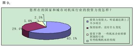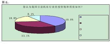 調(diào)查數(shù)據(jù)顯示,40.0%的受訪者認(rèn)為我國目前機(jī)床行業(yè)的投資“大體上飽和,但還有投資空間”,33.1%認(rèn)為“不飽和,還需要加大投資力度”。(詳見圖8)該結(jié)果表明,三分之一的被訪者認(rèn)為機(jī)床行業(yè)還有投資的空間,加上那些認(rèn)為投資空間很大的比例,有超過一半的人認(rèn)為機(jī)床行業(yè)還應(yīng)該增加投資,業(yè)界對機(jī)床行業(yè)的預(yù)期由此可見一斑。
