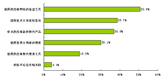 通過對替代方式的調(diào)查發(fā)現(xiàn),不同品牌物料之間的替換成為2010年使用替代物料的最主要方式,而2009年的調(diào)查結(jié)果中廠商新老產(chǎn)品替換占據(jù)主流。替代方式側(cè)重點的變化也反映了供應(yīng)鏈中物料品牌替換比較活躍,這為新的品牌供應(yīng)商切入市場提供了機會。那么工程師如何獲得品牌替代信息呢?通過調(diào)查發(fā)現(xiàn),使用在線工具是尋找物料品牌替代信息成為新寵。在線工具包括供應(yīng)商網(wǎng)站的選型工具、目錄分銷商的搜索工具、供應(yīng)商替代搜索工具。此外,技術(shù)文章也是影響工程師選擇的重要方式,而技術(shù)文章恰恰是國內(nèi)元器件供應(yīng)商的短板。