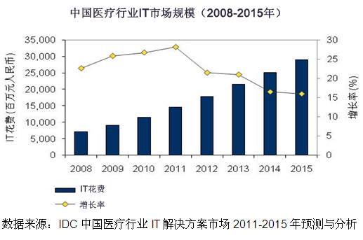 區(qū)域醫(yī)療信息平臺(tái)建設(shè)已逐步成為醫(yī)療信息化發(fā)展的引擎,醫(yī)療信息化市場繼續(xù)高速增長。根據(jù)IDC最近發(fā)布的報(bào)告《中國醫(yī)療行業(yè)IT解決方案市場2011-2015年預(yù)測與分析》,2010年醫(yī)療行業(yè)IT花費(fèi)是114.1億元人民幣,較2009增長26.7%;預(yù)測到2015年IT花費(fèi)市場規(guī)模達(dá)到290.2億元,2010至2015年的年復(fù)合增長率為20.5%。在各類醫(yī)療解決方案中,區(qū)域醫(yī)療信息平臺(tái)的增長最快,2010-2015年復(fù)合增長率達(dá)24.7%。