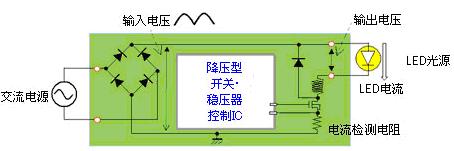 羅姆為了適應(yīng)上述市場需求而在進行LED照明用驅(qū)動器IC的開發(fā)。為使LED保持一定的亮度點燈,需要有進行恒流控制的LED驅(qū)動器IC。通常,是從交流電源開始進行恒流控制,所以使用降壓型開關(guān)穩(wěn)壓器方式(圖1)。