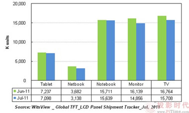 據(jù)市調(diào)機構(gòu)WitsView公布最新7月份大面板出貨調(diào)查報告,2011年7月份大尺寸面板出貨量為5,643萬片,較6月份減少5.2%,較去年同期成長11%。WitsView預(yù)估,第3季出貨季增率只有1%至3%,出貨表現(xiàn)旺季不旺,季增率將是史上第3差。