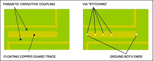 填充地也稱為保護(hù)線,通常將其用于電路中很難鋪設(shè)連續(xù)接地區(qū)域或需要屏蔽敏感電路的設(shè)計(jì)(圖10)。通過在引線兩端,或者是沿線放置接地過孔(即過孔陣列),增大屏蔽效應(yīng)。請(qǐng)不要將保護(hù)線與設(shè)計(jì)用來提供返回電流通路的引線相混合,這樣的布局會(huì)引入串?dāng)_。