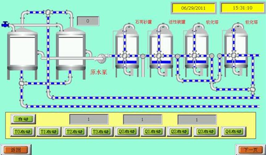 制藥用水是不含任何添加物的工藝用水。制藥用水的系統(tǒng)控制要控制這些雜質(zhì)的含量,同時(shí)還要有效處理和控制微生物及細(xì)菌內(nèi)毒素的污染。通常會(huì)采用離子樹脂交換、蒸餾冷凝、電滲析、反滲透等工藝方式。其制備流程大致分為五部分:預(yù)處理、初級(jí)除鹽裝置、深度除鹽裝置、后處理裝置、純水輸送分配系統(tǒng)。純化水設(shè)備包含機(jī)械部分和電氣部分:機(jī)械部分主要由水泵、壓力罐、水箱、電磁閥、過(guò)濾器和管路組成;電氣部分主要由可編程控制器(PLC)、觸摸屏、變頻器、壓力表、繼電器等組成。圖1為制備純化水的一個(gè)現(xiàn)場(chǎng)展示案例。