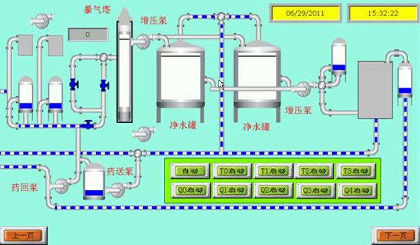 觸摸屏主要功能是顯示和控制制水過(guò)程中的數(shù)據(jù)以及水泵電磁閥的的運(yùn)行狀態(tài)。PLC輸入量有各個(gè)閥門的開(kāi)閉情況和各罐體的液位情況和壓力情況,其中輸入量中的液位是模擬量輸入;輸出量有水泵的啟動(dòng)停止,電磁閥的開(kāi)閉,報(bào)警等等。圖3為部分觸摸屏的控制界面(初期設(shè)計(jì))。