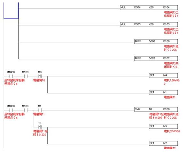 PLC程序主要分為以下基本:初始化部分、模擬量采集部分、數(shù)據(jù)處理部分、邏輯控制部分(手動(dòng)和自動(dòng))、報(bào)警部分等組成。圖4為部分PLC程序設(shè)計(jì)。