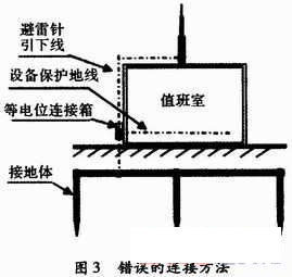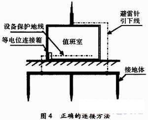 目前,關(guān)于共用接地有一種誤解,認(rèn)為將設(shè)備的接地引線無(wú)論怎樣連接,最終只要接在同一個(gè)接地體上就算是共用接地,如圖3所示。將“共引線”也誤認(rèn)為是“共地”。其實(shí)不然,所謂“共用接地”就是把許多不同性質(zhì)的接地裝置如電氣安全接地、交流電源工作地、通信及計(jì)算機(jī)直流地等匯集于一個(gè)等電位連接箱,使之成為一個(gè)等電位體,然后直接與接地體連接,而防雷地則通過(guò)另一條引下線與接地體連接。而不是將室內(nèi)設(shè)備接地與室外防直擊雷接地通過(guò)同一根引下線與地相連。更不允許將室內(nèi)接地引線與室外防直擊雷引線匯集與一個(gè)所謂的等電位連接箱,然后再與接地體相連。室內(nèi)接地引線要遠(yuǎn)離室外防雷引下線,如圖4所示。否則,遇雷擊時(shí),強(qiáng)大的雷電流在通過(guò)引線向大地泄放的同時(shí),室內(nèi)引線及所有設(shè)備上瞬間便會(huì)產(chǎn)生很高的電位差,設(shè)備難免遭到破壞。另外,假設(shè)與接地體相連的引線因銹蝕斷開(kāi)或等電位連接端子接觸不良,一旦發(fā)生雷擊,強(qiáng)大的雷電流便會(huì)直擊至值班室設(shè)備上,這是非常危險(xiǎn)的。