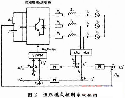在對機(jī)車蓄電池充電時,為了快速充電同時延長電池的使用壽命,將充電與放電過程分成不同的階段,可以視具體情況分階段選擇恒流或者恒壓模式充放電。恒壓充放電模式采用電壓定向控制模式,控制框圖如圖2所示??刂撇呗圆捎秒p閉環(huán)結(jié)構(gòu),外環(huán)控制直流電壓,內(nèi)環(huán)控制電流。電流內(nèi)環(huán)作用是提高系統(tǒng)的動態(tài)性能和實現(xiàn)限流保護(hù),電壓外環(huán)的作用是保證直流側(cè)電壓的穩(wěn)定性。直流輸出電壓給定信號和實際直流電壓Vdc比較后的誤差信號送入P1調(diào)節(jié)器,PI調(diào)節(jié)器的輸出即為主電路交流輸入?yún)⒖茧娏鞯姆担容^得到電流誤差后,對電流誤差進(jìn)行PI調(diào)節(jié),用以減緩電流在動態(tài)過程中的突變。然后再與輸入電壓的空間矢量進(jìn)行比較控制,最后通過SPWM調(diào)制算法即可生成相應(yīng)6路驅(qū)動脈沖控制三相整流橋IGBT的通斷,間接地控制網(wǎng)側(cè)電流,實現(xiàn)網(wǎng)側(cè)功率因素的調(diào)節(jié)。