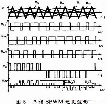 本文采用SPWM調(diào)制方式。圖2中,三相調(diào)制信號uru、urv和urw為相位依次相差120°的正弦波。a,b,c相自關(guān)斷開關(guān)器件的控制方法相同,現(xiàn)以a相為例:在uru>uc的各區(qū)間,給上橋臂電力晶體管V1以導(dǎo)通驅(qū)動信號,而給下橋臂V4以關(guān)斷信號。在uru<uc的各區(qū)間,給V1以關(guān)斷信號,V4以導(dǎo)通信號。圖5是三相橋式PWM逆變電路輸出三相對于負(fù)載中性點N的相電壓波形。