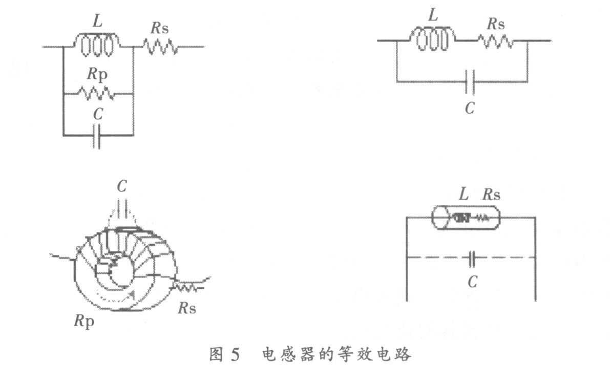 電感器由纏繞在磁芯上的導(dǎo)線構(gòu)成, 其特性則由所使用的磁芯材料決定??諝馐菢?gòu)成電感器最簡單的磁性材料, 但為使電感器具有更高的電感量,經(jīng)常用鐵、鐵氧體等磁性材料做磁芯。電感器的典型等效電路如圖5 (a) 所示, 圖中Rp 代表磁性的鐵耗, Rs 代表導(dǎo)線的銅耗, C 是繞線間的分布電容。對(duì)于低值電感應(yīng)使用圖5 (b) 所示的等效電路。由于L 值很小, 繞組間的分布電容就成了主要的影響因素。