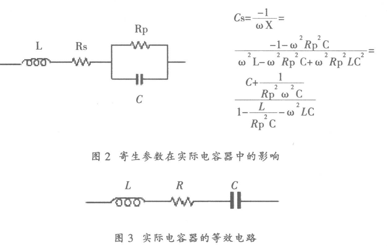 電容器的典型等效電路如圖1 所示, 在該電路中, 電容量C 是電容器的主要成分, Rs 和L 是引線和電極中存在的寄生參數(shù), Rp 代表兩個(gè)電極間的寄生泄漏參數(shù)。
