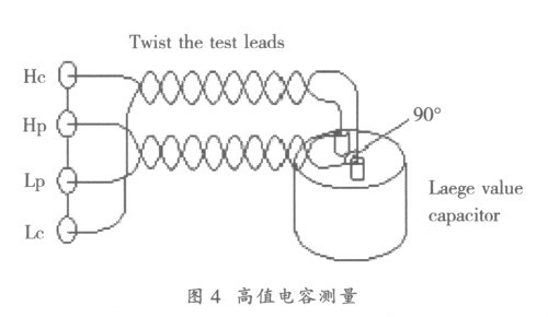 在電容器的測量中, 應(yīng)注意的事項(xiàng)與被測電容量有關(guān), 高值電容測量屬于低阻抗測量, 因此必須把接觸電極、測試夾具和電纜中的接觸電阻及殘余阻抗減到最低, 應(yīng)使用4 端、5 端或4 端對(duì)配置把DUT 接到儀器上。在使用4 端和5 端配置時(shí), 必須確保高測試信號(hào)電流流過電纜, 為避免電磁場耦合的影響, 按圖4 所示的方式來連接電纜;此外, 為進(jìn)行精確測量, 應(yīng)正確使用開路、短路補(bǔ)償。特別是對(duì)于施加直流偏置電壓的電解電容器,應(yīng)在直流偏置設(shè)置為ON (0 V) 時(shí)進(jìn)行開路/短路補(bǔ)償。