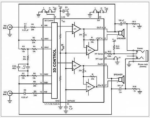 觀察到的3D數(shù)量也取決于其它許多因素,如喇叭的放置及與收聽者的距離。因此,建議用戶嘗試R5(R3D)和 C7(C3D)的各種數(shù)值,以感覺3D效應(yīng)如何在應(yīng)用程序中工作。對(duì)于效果來說沒有什么對(duì)或錯(cuò),而只是使每位用戶達(dá)到最滿意的程度問題而已。請(qǐng)注意當(dāng)啟動(dòng) 3D模式時(shí),(R3和R4),(R7和R6)的設(shè)置僅用于增益控制。當(dāng)抑制3D模式時(shí),增益由R2和R8設(shè)置。