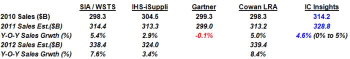 Cowan指出,在這5個(gè)最近發(fā)布的預(yù)測(cè)中,有3個(gè)都認(rèn)為2011年該市場(chǎng)的成長(zhǎng)仍然會(huì)有3,132億~3,134億美元左右; Gartner 較悲觀,預(yù)估為2,990億美元;IC Insights 則樂(lè)觀地認(rèn)為會(huì)高于3,280億美元。