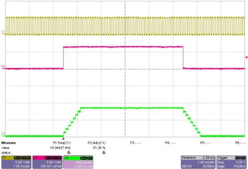 圖 2 10 kHz 時(shí)鐘頻率時(shí)的 LED 開(kāi)啟和關(guān)閉情況