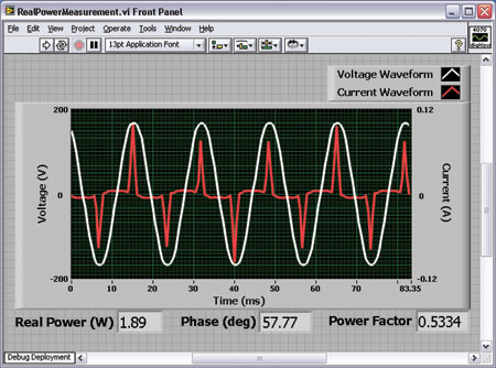功率損耗的更精確描述可以通過測量設(shè)備的真實功率,或“近似功率”獲得,這種測量必須考慮信號的波形和相位。分析真實功率的方法之一是使用兩臺同步的PXI-4071 FlexDMM設(shè)備,每臺都具有采集電壓和電流波形速率高達1.8Ms/s的能力,并提供標準DMM的讀數(shù)方式。