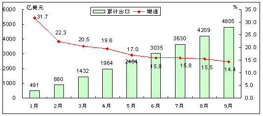 1-9月,電子信息產(chǎn)品進出口總額達到8280億美元,同比增長13.7%;其中,出口4805億美元,同比增長14.4%,占全國外貿(mào)出口的34.5%;進口3475億美元,同比增長12.7%,占全國外貿(mào)進口的27.0%。與上半年相比,出口和進口增速分別回落1.4和2.6個百分點。