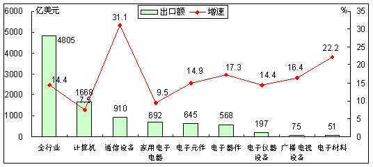 整機行業(yè)出口分化態(tài)勢明顯。1-9月,家電與計算機行業(yè)出口保持緩慢增長態(tài)勢,出口額分別為692和1668億美元,同比增長9.5%和7.5%,增速低于全行業(yè)平均水平4.9和6.9個百分點;通信設備行業(yè)出口保持較快增長,出口額910億美元,同比增長31.1%,增速高于全行業(yè)平均水平16.7個百分點。與上半年相比,家電行業(yè)出口增速回落1.5個百分點,計算機行業(yè)提高2.3個百分點,通信設備行業(yè)回落4.5個百分點。