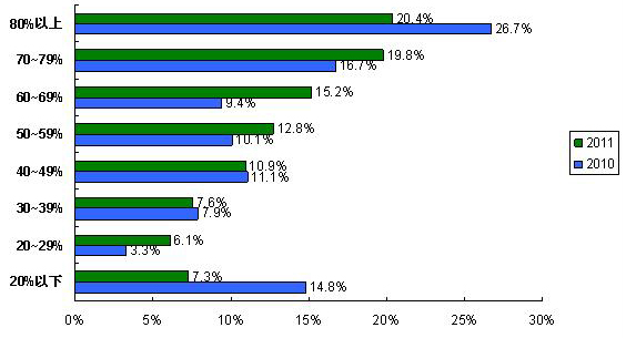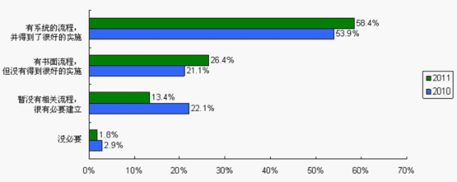 供求雙方把伙伴關系建立在專業(yè)評估的基礎上,通過系統(tǒng)流程可以有效減少供應商認證和引入過程中的不合理操作、暗箱操作、防范采購風險、提高采購效率。在供應商認證與引入過程中,沒有建立和認為沒必要建立系統(tǒng)流程的受訪者比例由2010調查的25%(22.1%+2.9%)降至2011調查的15.2%(13.4%+1.8%),已經建立流程并且得到很好實施的比例也由2010調查的53.9%上升至2011調查的58.4%。