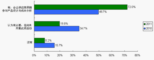 讓供應商參與早期的產品設計是增進供求雙方伙伴關系的途徑之一,借助供應商的技術優(yōu)勢,挖掘元器件成本空間,從而提高產品競爭力、加快產品上市、降低成本。讓供應商早期參與產品設計與成本分析由2010調查的49.7%大幅上升至2011調查的72%,而其中69.2%是主芯片供應商的參與,30.8%是被動元件供應商的參與。