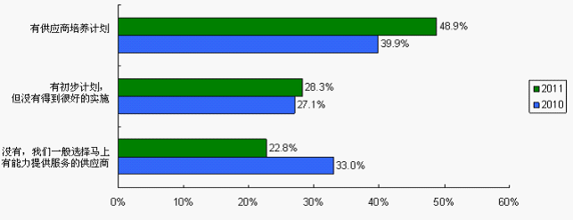 培養(yǎng)供應商有利于建立供求雙方的伙伴關系,提高供應商忠誠度,增強采購風險抵御能力。有供應商培養(yǎng)計劃的系統(tǒng)廠商由2010調查的39.9%上升至2011調查的48.9%,而沒有計劃的由2010調查的33%降至22.8%。