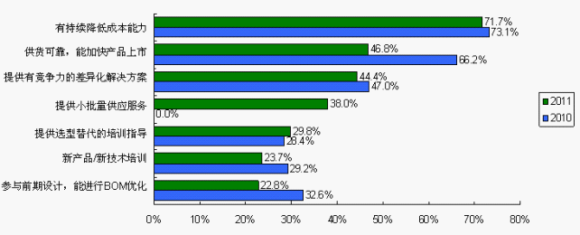 此外,工程師對成本降低持續(xù)關注,小批量供應服務成為工程師關注的亮點。隨著市場的企穩(wěn),供貨可靠不再變成重大事件。2011中國電子制造商采購行為調查發(fā)現(xiàn),工程師對供貨穩(wěn)定可靠的期望由2010調查的66.2%大幅降至2011調查的46.8%。