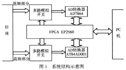 電路板上輸出的待測信號主要有三類:電源信號、脈沖數(shù)字信號、電平變換信號。此外還有一些頻率較高的模擬信號,如音視頻信號,此類信號一般不作為關(guān)鍵測試信號,若需測試時(shí)可按高頻信號進(jìn)行采集。其中電源信號和電平變換信號均可視為直流信號來采集,用 AD7864 完成采集。而脈沖數(shù)字信號的頻率較高,動輒就幾十兆赫茲甚至上百兆赫茲,需要用高速的AD(本系統(tǒng)中用的是AT84AD331) 來進(jìn)行采集,并且需要對頻率進(jìn)行測量。因此本系統(tǒng)信號采集分為低頻和高頻兩個(gè)部分,下面分別敘述: