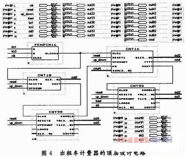 頂層設計采用原理圖輸入方式。通過調(diào)用生成的各模塊符號,并將它們作適當連接以實現(xiàn)頂層文件的設計。出租車計費器的頂層設計電路,如圖4所示。