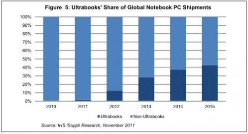 近日消息,據(jù)外媒報(bào)道,根據(jù)IHS iSuppli公司計(jì)算平臺部門的研究報(bào)告顯示,為了抵擋媒體平板日益增強(qiáng)的威脅,移動(dòng)PC市場正在力推新型超級本平臺,預(yù)計(jì)其出貨量到2015年將占到整體筆記本市場的40%以上。