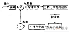 現(xiàn)在所用的頻譜分析儀多為超外差式,并采用多次變頻(3~4次),以降低中頻頻率,實(shí)現(xiàn)窄通帶和高分辨力。超外差式頻譜分析儀的基本工作原理如圖 1所示。輸入信號(hào)與本振(LO)混頻,產(chǎn)生中頻(IF)信號(hào)經(jīng)窄帶中放被送到包絡(luò)檢波器,檢波器輸出信號(hào)被放大并使屏幕顯示產(chǎn)生垂直偏轉(zhuǎn),掃描發(fā)生器保證屏幕顯示的水平頻率軸和本地振蕩器調(diào)諧同步,它同時(shí)驅(qū)動(dòng)水平偏轉(zhuǎn)調(diào)諧LO。