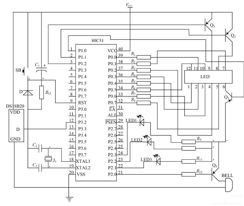 包括信號(hào)采集、系統(tǒng)控制、數(shù)字顯示、高溫報(bào)警四個(gè)部分。傳感器DS18B20 為信號(hào)采集器件所采集到的溫度信號(hào),通過內(nèi)部處理由傳感器的DQ 端送到單片機(jī)P3. 2 端口,經(jīng)單片機(jī)的計(jì)算處理后,由P0 口和P1 口分別作為4 位共陽數(shù)碼管的段控信號(hào)和位控信號(hào),共同完成對(duì)所測(cè)溫度值的數(shù)字顯示,最高位是符號(hào)顯示,如顯示負(fù)號(hào)“-”時(shí),表示當(dāng)前溫度是負(fù)溫度,否則為正溫度;由P2. 0 端口控制蜂鳴器,當(dāng)測(cè)量的溫度超過“預(yù)設(shè)報(bào)警溫度”時(shí),發(fā)出提示音報(bào)警; P2. 1~ P2. 3 端口來控制黃、綠、紅3 個(gè)發(fā)光二極管分別表示低溫、正常、高溫三種溫度狀態(tài)。石英晶體JT 和電容C2 ,C3 共同組成晶振電路; 電容C1 、電阻R 13、S B 共同構(gòu)成復(fù)位電路; 其中電阻R13為下拉電阻,SB 為手動(dòng)復(fù)位按鈕。