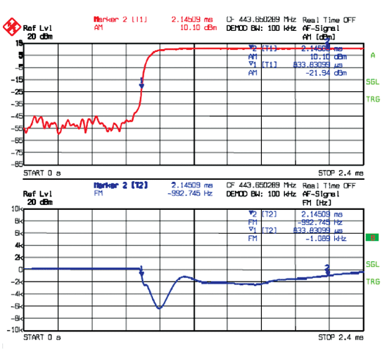 對(duì)于發(fā)射機(jī)和頻綜源來(lái)說(shuō),它們的幅度、頻率和相位瞬態(tài)特性是重要的測(cè)試指標(biāo)。一般來(lái)說(shuō),頻率穩(wěn)定時(shí)間是指發(fā)射機(jī)在輸出電平達(dá)到一定數(shù)值(通常為穩(wěn)定輸出功率-30dB)開(kāi)始,監(jiān)測(cè)FM解調(diào)頻譜,直到頻率穩(wěn)定到設(shè)計(jì)限值之內(nèi)的這一段時(shí)間。