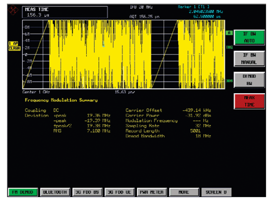 圖6是羅德與施瓦茨公司頻譜儀選件FS-K7在分析調(diào)頻信號(hào)的應(yīng)用。它采用上述解調(diào)原理,可以實(shí)時(shí)解調(diào)調(diào)頻、調(diào)幅、調(diào)相和實(shí)時(shí)頻譜。