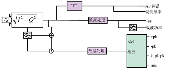對(duì)此數(shù)組進(jìn)行窄帶低通濾波,獲得載波幅度數(shù)組Vc ,計(jì)算AM-DC與Vc的差分?jǐn)?shù)組,它與Vc的比值A(chǔ)Mdeep 數(shù)組表述調(diào)制深度,對(duì)其進(jìn)行檢波:正峰值 (+pk):數(shù)組中的最大值;負(fù)峰值 (+pk):數(shù)組中的最小值;峰-峰值/2 (1/2pk-pk):數(shù)組中的最大值與最小值差值的一半;均方根值 (rms):數(shù)組中數(shù)值的均方根值。
