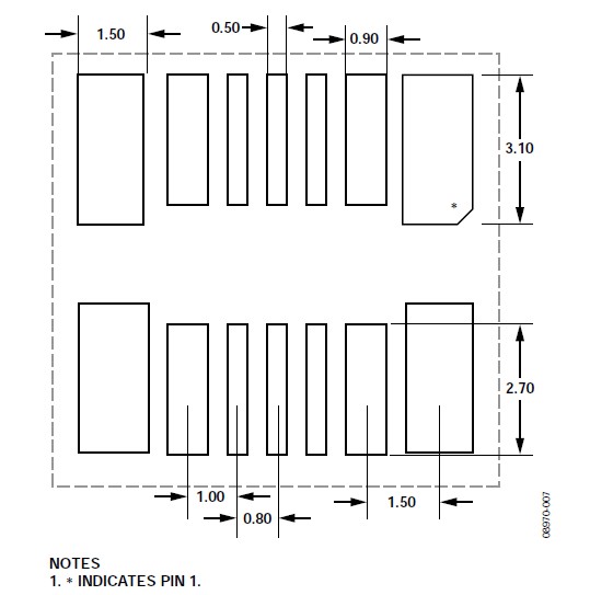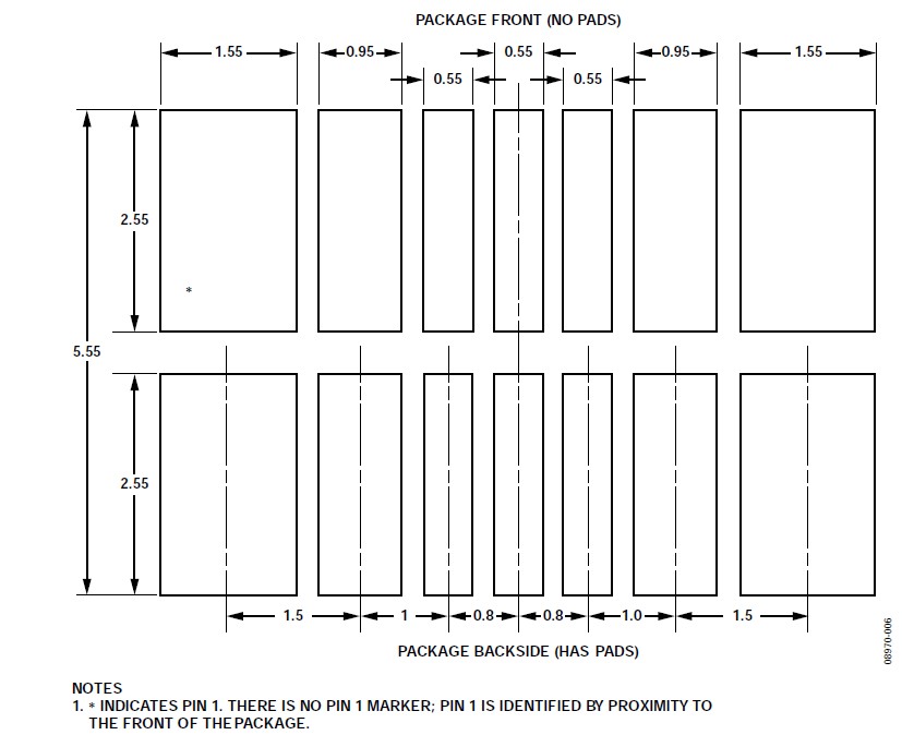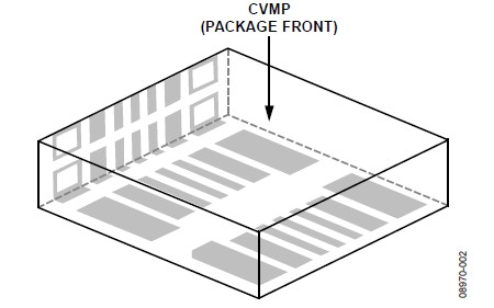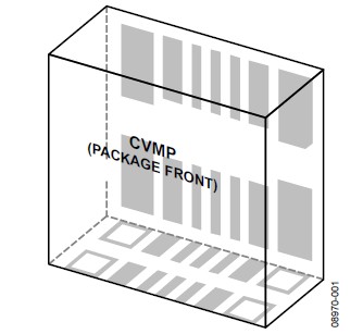 關(guān)于垂直和水平安裝方向的CVMP焊盤布局(焊盤圖形),請(qǐng)參閱本應(yīng)用筆記的"焊盤布局"部分。CVMP背面的焊盤布局如圖7所示。注意,封裝正面上有一些額外的焊盤(見圖4)沒有顯示在焊盤布局中,這些焊盤用作測(cè)試點(diǎn),不應(yīng)進(jìn)行電氣連接。