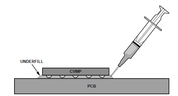 焊接完成后,由于焊料厚度有限,封裝與PCB之間會(huì)有一個(gè)較窄的空間。已經(jīng)證明,用底部填充材料填充此空間可以改善焊接抗疲勞壽命,因?yàn)樗軠p輕這種封裝(引腳為嵌入式,不能用來釋放應(yīng)力)中焊點(diǎn)應(yīng)力的影響。