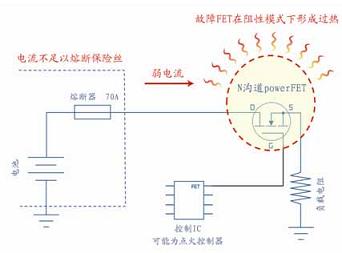 圖1 說明了一個出現(xiàn)故障的powerFET可能并不會產生一個完全硬短路的過流情況,而是產生阻性短路,因此通過I2R發(fā)熱造成不安全的溫度。在這種情況下,所形成的電流可能并沒有高到使一個標準保險絲熔斷并阻止印制電路板上的熱失控。
