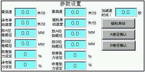 主畫(huà)面反映了全部傳動(dòng)軸的運(yùn)行狀態(tài)、當(dāng)前放卷卷徑、線速度,以及各個(gè)擺桿的張力角度位置等,如圖3所示。參數(shù)設(shè)置界面提供了一些工藝參數(shù)數(shù)據(jù)等,如圖4所示。