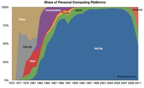 美國(guó)市場(chǎng)調(diào)研公司Asymco分析師賀拉斯·德迪歐(Horace Dediu)發(fā)布報(bào)告稱,傳統(tǒng)x86架構(gòu)Windows PC(Wintel)在全球個(gè)人計(jì)算設(shè)備中的份額已經(jīng)降至50%左右。在1995年至2005年期間,Wintel曾幾近完全壟斷個(gè)人計(jì)算設(shè)備。