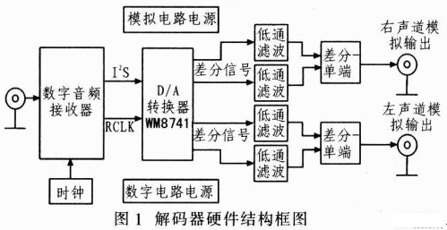 圖1是該解碼器硬件結構框圖,其中數(shù)字音頻接收器采用CirrusLogic公司的高速數(shù)字音頻接收器CS8416,該器件支持包括S/PDIF在內(nèi)的多種音頻輸入,取樣頻率范圍為32~192kHz。CS8416通過I2S接口與WM8741相連接。I2S總線只處理音頻數(shù)據(jù),其他控制信號必須單獨傳輸。CS8416的工作原理:接收器把接收到的S/PDIF格式的數(shù)字音頻數(shù)據(jù)進行解碼轉換,同時重建音頻數(shù)據(jù)中的時鐘并提供給后續(xù)WM8741,音頻數(shù)據(jù)則通過I2S總線接口發(fā)送給WM8741。WM8741按照設定的參數(shù)完成數(shù)模轉換后,再以差分形式輸出左右通道的模擬音頻信號,并經(jīng)低通濾波器濾除高頻諧波噪聲,最終得到高質(zhì)量模擬電壓信號。如果輸出接口為RCA,還需將差分信號轉換為單端信號。