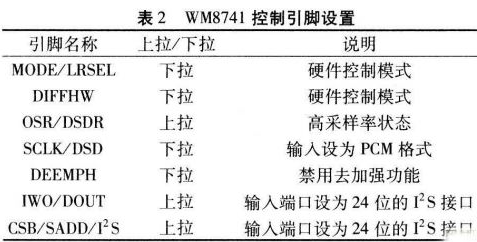 WM874l的I2S輸入接口與CS8416的輸出連接時中間加入100Ω電阻進行緩沖,如圖2所示。WM874l設定硬件控制模式,即通過特定引腳的上拉或下拉狀態(tài)決定其工作狀態(tài),且所有上拉或下拉的電阻均為10kΩ。該系統(tǒng)設計的WM8741控制引腳設置如表2所示。