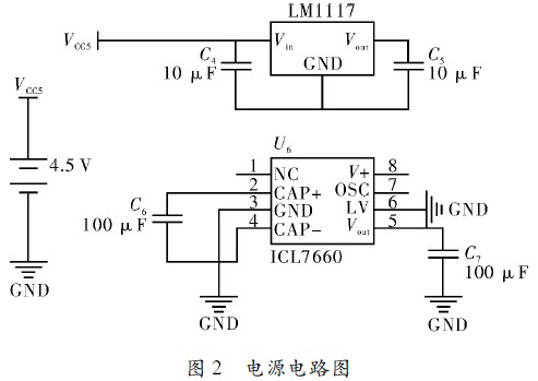 Intersil公司生產(chǎn)的ICL7660是提供雙電壓的COMS集成芯片,它在提供正負(fù)電壓方面有獨(dú)特的優(yōu)勢。ICL7660可以提供+1.5~+10 V和-1.5~-10 V的正負(fù)電壓。ICL7660正輸出電壓Vout+和負(fù)輸出電壓分別接入INA126電源的正負(fù)極。電源模塊的電路原理如圖2所示。